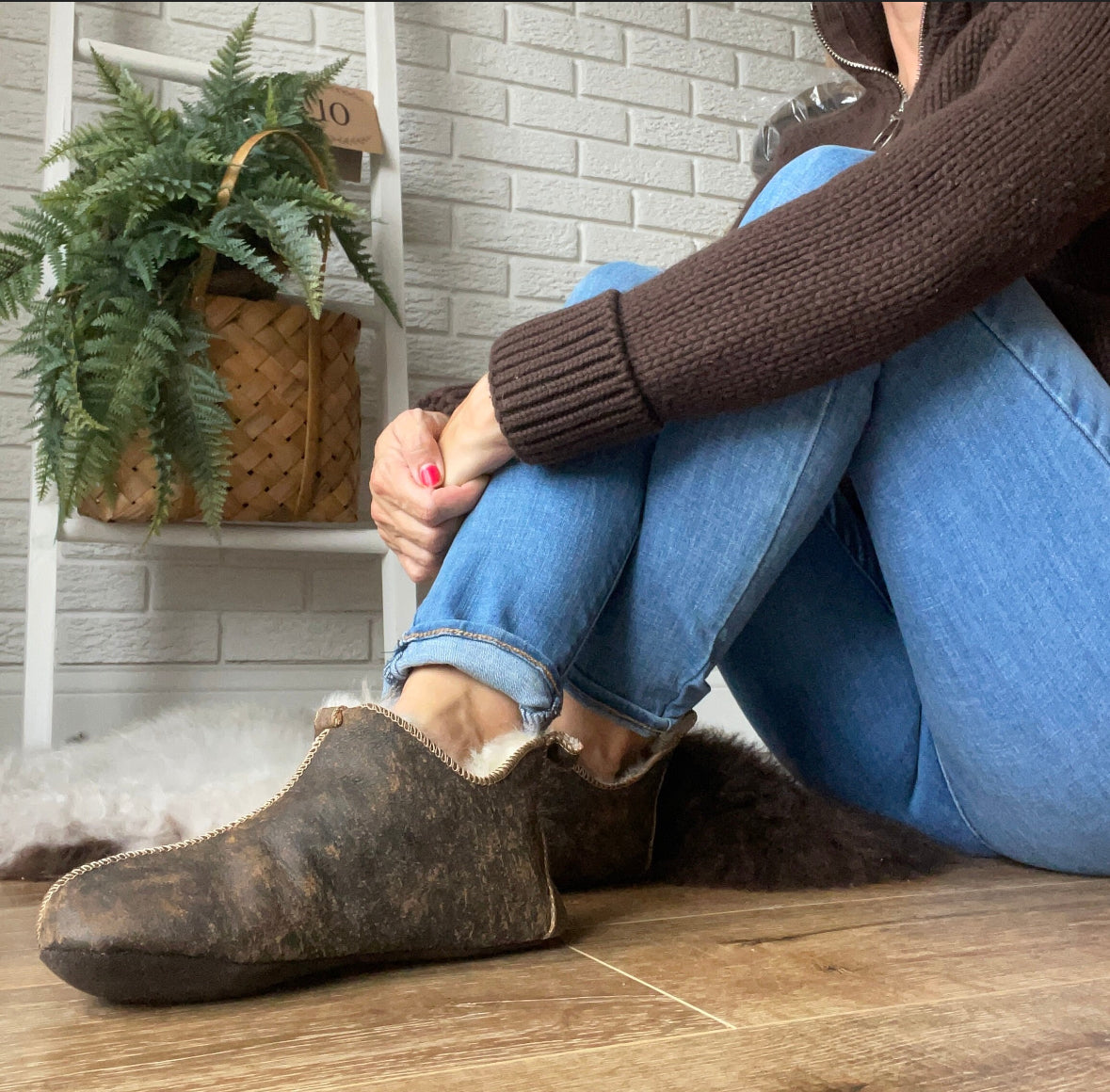 Follkee Slippers Bambosh Sheep Skin Wool Lined House Shoes Mens Slippers Womens Slippers Brown Deka Slippers Handcrafted