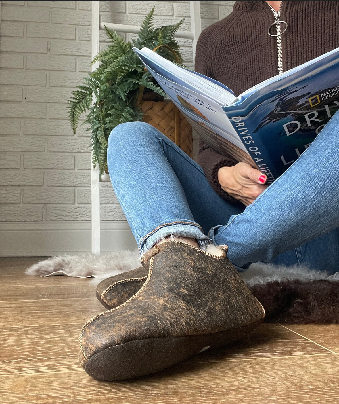 Follkee Slippers Sheepskin Wool Bambosh Style Handcrafted from sustainable sheepskin. Color Brown with Special Finish Denim