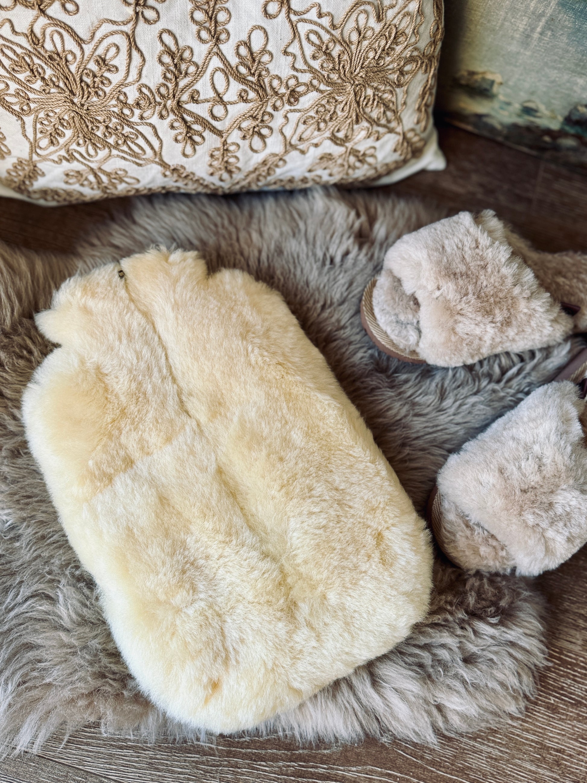 Using a hot bottle for various ailments is an ancient tradition worldwide. Our hot bottle warmer is nestled in a beautiful natural sheepskin, which keeps the water at an ideal temperature while also being healing and cozy to the touch.