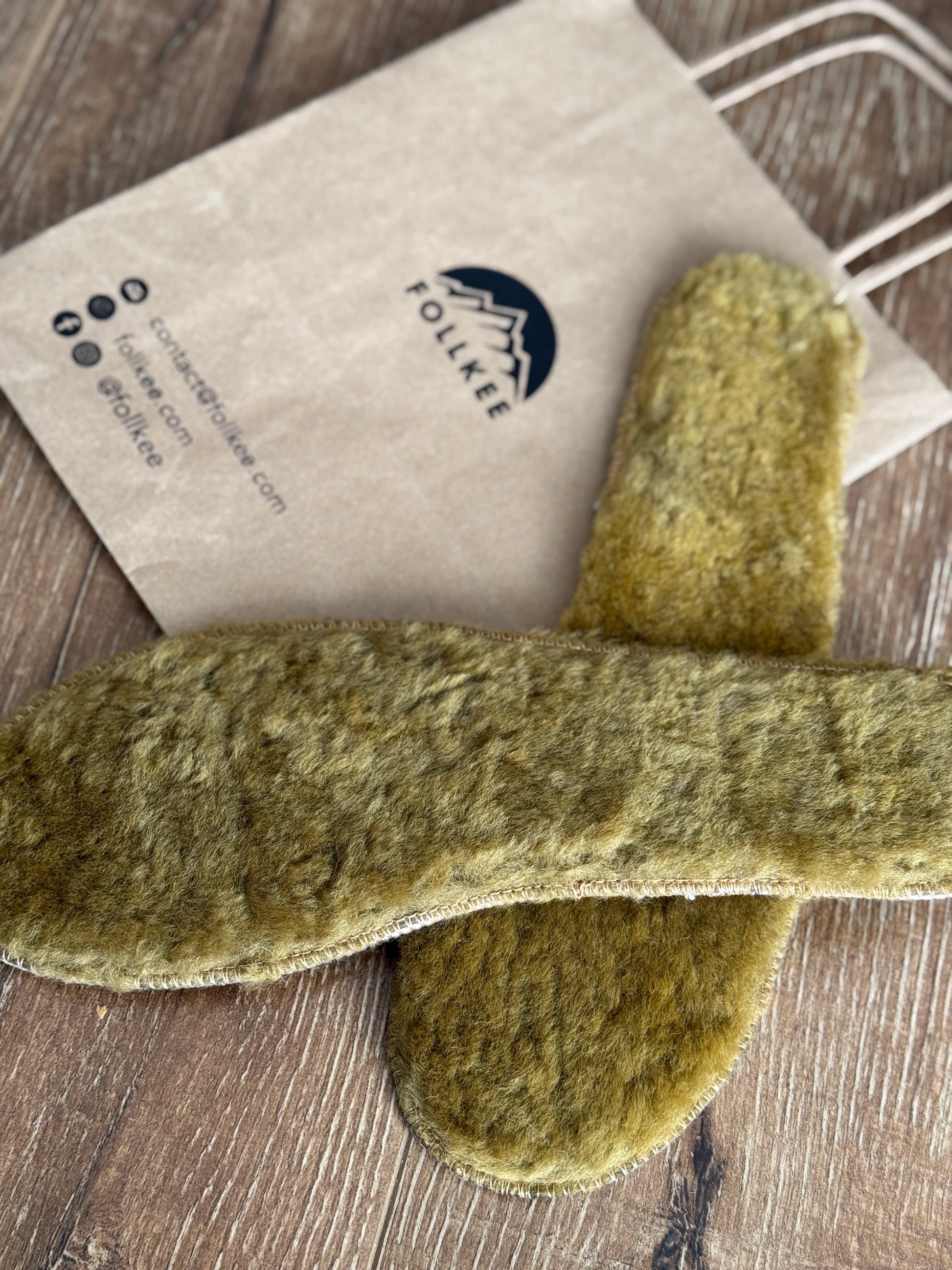 The insoles are made of wool at the top, wool fleeces at the bottom, and a layer of cardboard in-between to add mild to medium stiffness - thanks to which they do not bend in the shoe, do not move, and do not come out of the shoe when you take them off!